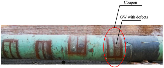 A variety of internal and external artificial defects (see Figure 2 and Appendix A) were manufactured by EDM (Electrical Discharge Machining) into the coupons (see Figure 3), located both upstream and downstream of the GWs’ surface (at weld), as well as in the center of the GWs’ surface (in weld), in order to test the inspection performance for sensitivity and repeatability. Test pipe is of X65 steel with outside diameter of 813 mm. Altogether 12 coupons were manufactured. Nominal Wall Thickness (WT) is 14.5 mm for all spools, apart from one spool which was 12.5 mm for WT change.