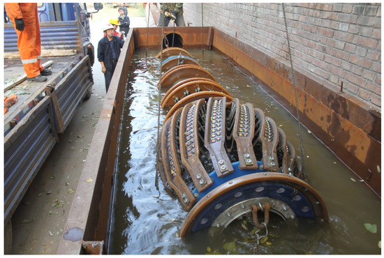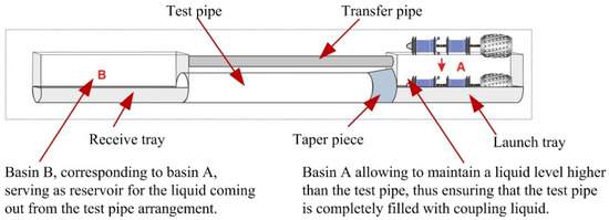 Diagrams of the pull test facility are shown in Figure 4. The Inline Inspection (ILI) tool is placed in the launch tray in full operation mode and connected with the pulling rope. The liquid level is high enough to ensure that the interior of the test pipe is completely filled with water. A series of 10 pull-throughs was executed to validate repeatability and reproducibility at the speed of approximately 0.1 m/s~0.5 m/s. Pictures of the facility are shown in Figure 5.