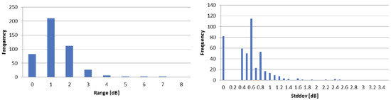 91.4% of the maximum amplitude ranges are within the 2 dB range. This shows a good reproducibility of the measurements. The standard deviation is within a 1 dB range in 93.2% of the cases and confirms the reproducibility of the data.