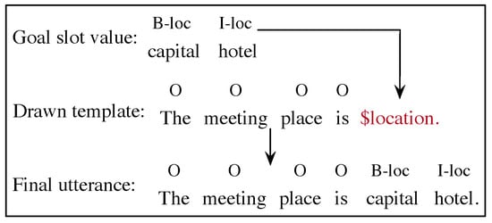 NLG: the selected action is projected to next user utterance for replying to dialogue manager. A template-based NLG is used to produce such user utterances. The responding template is drawn from a set of pre-defined templates according to the selected action . To assure the generalization and expressiveness, the templates are delexicalized by replacing concrete slot values with their slot names. For some slot dependent actions (e.g., inform()), the drawn template is lexicalized with the goal slot values to generate the final user utterance. An example of user utterance generation is shown in Figure 2, where B-loc, I-loc and O denote the slot labels of the beginning character of a location, inter character of a location and other characters, respectively.