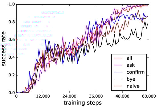 Considering reward shaping influence on convergence, the different adjacency pairs settings for reward shaping are compared. There are five settings: all the types of adjacency pairs, only ask-action adjacency pairs, only confirm-action adjacency pairs, only bye-action adjacency pairs and naive reward function. The training curves are shown in Figure 3. These success rate curves are obtained through testing dialogue managers with their respective learning simulator after every 300 training steps. Two settings (i.e., all the types of adjacency pairs and only ask-action adjacency pairs) achieve the best performance on speed up learning.