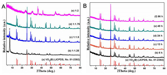 The synthetic conditions took a significant part in the formation of VO2(B) nanobelts. Figure 1A demonstrates the XRD pattern of the samples at various ratio of V:C. When the ratio of V:C is 1:1.25, an unknown solid was obtained based on our knowledge. With the increase of V:C, the characteristic peaks of VO2(B) (JCPDS, No. 81-2392) were obtained and pure phase of VO2(B) was synthesized with V:C and increased to 1:1.75. However, when V:C continued to increase (V:C = 1:2), VO2(B) was not obtained and other vanadium oxides were prepared. Thus, V:C = 1:1.75 is suitable for the synthesis of VO2(B) with pure phase. Figure 1B describes the XRD patterns of VO2(B) prepared with various hydrothermal times, which discloses the evolution process of VO2(B)’s formation. As depicted in Figure 1B, VO2(B) was obtained at 6–96 h indicating that VO2(B) could be synthesized in a short time.