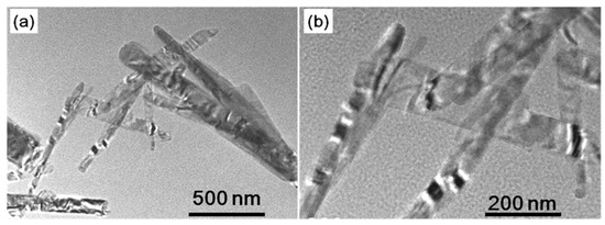 TEM images of the VO2(B) nanobelts at different scales: (a) 500 nm; (b) 200 nm.