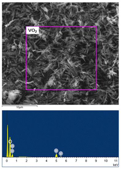 Further composition and structure information about the as-obtained VO2(B) was provided by EDS, FTIR, and Raman. The SEM image and its corresponding EDS spectrum of the as-obtained sample is shown in Figure 4, which indicates that the sample composes of vanadium and oxygen elements in consonance with the observation of XRD patterns. The IR and Raman spectra of the as-obtained VO2(B) is shown in Figure 5a. The absorption peaks among 1100 and 400 cm−1 are assigned to V-O vibration band in the IR spectrum [27,28]. The peak at 535 cm−1 is ascribed to the stretching modes of V-O-V, and that at 920 cm−1 is ascribed to V-O bonds. Meanwhile, the characteristic absorption peak of the VO2(B) nanobelts with layered structure is observed at 998 cm−1, which is assigned to the symmetric stretching vibration in VO2(B) (V4+ = O).