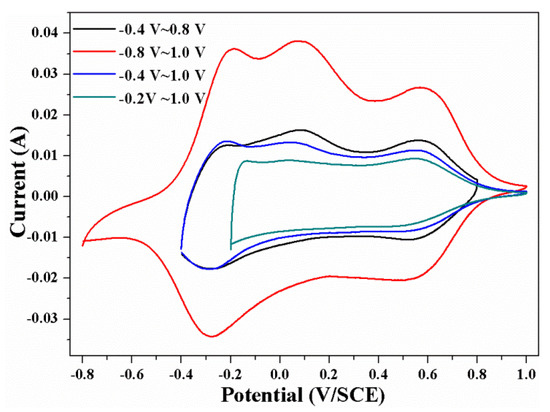 The CV curves of the VO2(B) nanobelts are shown in Figure 6. The results indicate that there is a large capacity at the potential limit of −0.8~1.0 V among a different potential limit. Hence, electrochemical curves of VO2(B) nanobelts were measured from −0.8 V to 1.0 V.