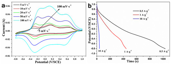 CV curves of the VO2(B) nanobelts at −0.8~1.0 V are shown in Figure 7a, and the scan rate is from 5 to 100 mV·s−1. The results indicate that the redox peaks are seen, disclosing that VO2(B) nanobelts storing charges are mainly on basis of a redox mechanism [34]. The corresponding redox reaction is described as follows: VO2 + xNa+ + xe− → NaxVO2. The x denotes mole fraction of inserted Na+. Original shapes of the CV curves remain almost unchanged as the increment of scan rate, which indicates there are excellent ionic and electronic conductivity in the VO2(B) nanobelts. Meanwhile, the peak moves to a higher potential for the electrode polarization effect. Furthermore, the peak current enlarges as scan rate increases, which shows the faradic redox reactions at surface is rapid enough, as well as the rates of ionic and electronic transport [35]. Figure 7b shows GCD curves of the VO2(B) nanobelts. When the discharge current densities are 0.5, 1 and 10 A·g−1, the specific capacitance are 287, 246, and 222 F·g−1. As the discharge current density increases (0.5–10 A·g−1), the specific capacitance decreases. One reason is that a lower use rate of VO2(B) occurs at the high current density in the process of charge-discharge, and the other one is that the incremental voltage drop is involved in the redox reaction [36,37]. The value of capacitance at current density of 10 A·g−1 remains 77% of that at current density of 0.5 A·g−1.The good rate capability is ascribed to the belt-like (Figure 2 and Figure 3) and porous (Figure 5b) structures of the VO2(B) nanobelts.