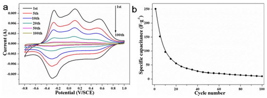 Figure 8 shows the cycling stability of the porous VO2(B) nanobelts. Figure 8a displays the CV curves at various cycles, which depicts the specific capacitance fades with the cycle increasing. Figure 8b shows the GCD curves to quantitatively observe the cycling stability, which displays similar results with CV curves. During the CV and GCD tests, the solution gradually turned yellow because of the dissolution of the VO2(B) nanobelts as electrode material in Na2SO4 electrolyte solution. This is an experimental phenomenon that often occurs when vanadium oxides are applied in SC and lithium-ion battery electrodes [27,39,40].