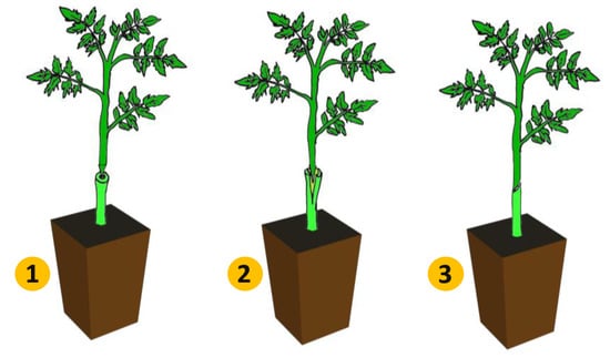 Grafting is a common practice in high value-added cucurbitaceous and solanaceous crops [20]. There are two basic grafting methodologies: One is where the grafting process retains the two root systems, that of the rootstock and of the scion (tongue approach grafting, side grafting); and the other is that in which a shoot from the scion is joined to the rootstock plant (cleft grafting, hole grafting, splice grafting) [21,22]. In the first case, less strict environmental conditions are required during the grafting period and the post-graft phase [23], but its application is complex in solanaceae, mainly because the plants are usually grafted very young when stem thickness is minimal (Figure 1).