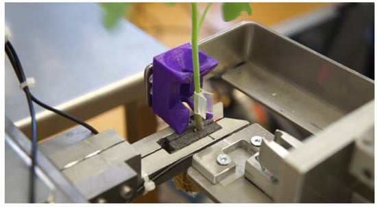 Detailed view of the fitting device and the grafting clip placement. It can be seen that the grafted plant is clamped by the robot that holds the rootstock and that the grafting clip is in place. Demonstrative video of the system: https://youtu.be/CgJE3NxJ0sA (accessed on 1 April 2020).
