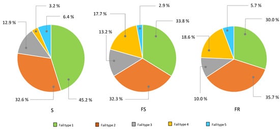 Orientating the seedlings by placing the union surface in front of the vertical clip opening (S) resulted in a greater success rate than orientating the graft by positioning the union surface with either the rootstock or scion in front of the clip opening. This difference in success, around 10% higher, is possibly due to the conventional clips used being prepared to make a clamping force in that determined orientation, compared to the other orientation alternatives. Sometimes, the failures reported were mainly due to the direction of tightening exerted by the clip sides, where the proper directional pressure was not applied, to keep the graft surfaces in intimate contact, or there was not a sufficient level of pressure. Moreover, because of the lack of protection in the clip opening area, the pointed end is free and sometimes loses contact with the other seedling surface. In a similar way, failures were classified and grouped into five categories, according to the origin that gave rise to the failed graft (Figure 9). For the strategy of junction orientation S, most failures were due to the stem tip bent over on itself or scratches and chafing in guiding and positioning the stem into the clip. The total failure rate was slightly higher than 10% for S. For junction orientation FR and FS, these failures are still the most important, but there is an increase in failures due to pinching off the stems by the clip, as these are slightly separated before tightening, and the lateral opening of the graft clip is limited. The total failure rate was higher than 25% for FR and FS alternatives.