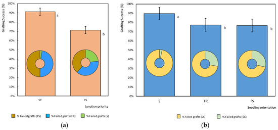 Consequently, the best grafting strategy tested to carry out the splicing graft was order-dependent; that is to say, positioning the seedlings first, and then fitting the grafting clip. It also depends on the seedling orientation, placing the union line perpendicular to the clip opening (Figure 10).