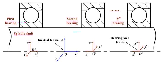 The scheme diagram of a shaft supported by multiple ACBBs is shown in Figure 1. O-xyz denotes the inertial coordinate system where the z-axis is coincident with the shaft axis, and Ok-xkykzk denotes the local coordinate system for the kth bearing in which the forward direction of the zk-axis is defined as from the small side of the bearing to its big side. Here, the quasi-static bearing model is presented in the bearing local coordinate system. A ball bearing is taken as an example to analyze the interactions between ball elements and raceways.
