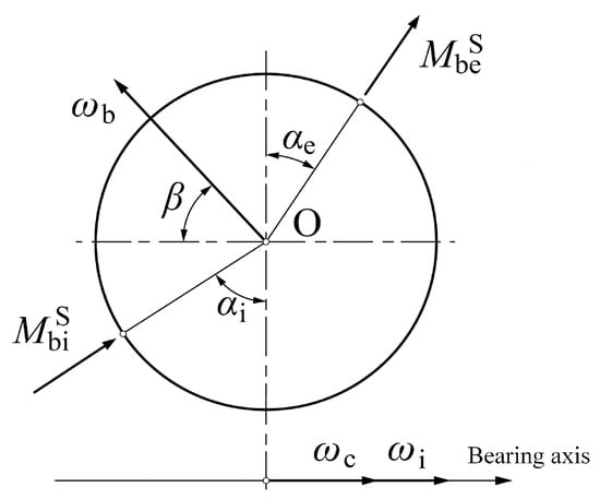 where and are the contact forces between the ball and inner/outer raceway. and are the semi-major axes of the contact ellipses for the ball and inner/outer raceways, respectively. is the second kind of elliptic integral function. and are the ratios of the semi-major axis to the semi-minor axis of the contact ellipses at the ball inner and ball outer raceway contacts, respectively. The detailed derivation of the pitch angle is omitted here and can be found in Ding’s work [16].