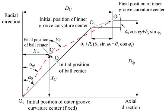 In Figure 3, , denote the axial and radial distance between the inner and outer raceway groove curvature centers at the jth ball element position and can be written as: