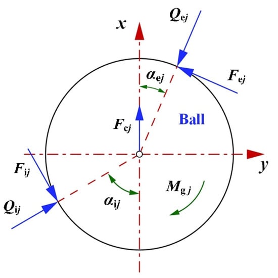 As shown in Figure 4, considering the centrifugal force , gyroscopic moment , contact forces and , and friction forces and , the force and moment equilibrium equations for the jth ball element can be presented as: