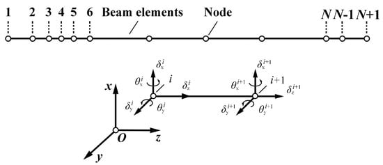 In order to consider shaft flexibility, the finite element method is adopted here, and the shaft is discretized into segments containing nodes using Timoshenko’s beam element, as shown in Figure 5. O-xyz is the inertial coordinate system of the whole shaft-bearing system (mentioned in Section 2.1). The torsional deformation of the shaft is ignored; only the bending and axial deformations are considered. The ith node on beam element has three translational DOFs , , and along the x-, y-, and z-axis, respectively, and two rotational DOFs , around the x- and y-axis, respectively. In the present shaft-bearing system, the bearing inner ring is close fit with the shaft; therefore, the inner ring of the bearing has the same displacements as the shaft node at the bearing mounting position. The displacement vector at the ith node location is: