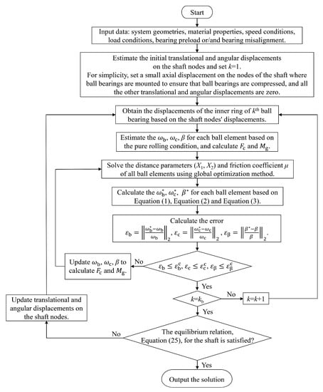 It is computationally infeasible to solve all the equations of the shaft-bearing system model together. Hence, a numerical scheme is proposed to solve the system model. The numerical solution process is presented in Figure 6. The shaft-bearing system properties, including material properties, geometrical parameters, operation conditions, load conditions, axial preload, and/or angular misalignment of ball bearing, are taken as the input parameters. The initial guess for the node displacements of the shaft, the spinning speed , orbital speed , and pitch angle of each ball element are also necessary to start the solution. Then, the distances parameters and friction coefficients of all ball elements in the kth ball bearing are solved together by the global optimization method. The new spinning speed , orbital speed , and pitch angle for ball elements are calculated based on Equations (1)–(3). The distances parameters , friction coefficients , speed parameters (,), and pitch angle are solved alternately until the corresponding converge criterion is reached. Once the above calculations for all the ball bearings are finished, the equilibrium equations of the shaft are checked. Since the loads applied on the shaft nodes provided by the ball bearings are a nonlinear function of the node displacements of the shaft, the equilibrium equation of the shaft, Equation (25), is nonlinear as a function of the shaft nodes’ displacements. Based on the first order Taylor expansion of nonlinear equilibrium equations of the shaft, the node displacements on the shaft are updated. The whole calculation process will be continued until the equilibrium equations of the shaft are satisfied. Then, the node displacements of the shaft, ball-raceway contact forces, spinning speed, orbital speed, and pitch angle for each ball element can be obtained. It should be noted that, in the innermost loop of the flowchart, the Newton–Raphson algorithm is not used to solve the equilibrium Equation (13) of all ball elements simultaneously to obtain the distance parameters and friction coefficients for the kth ball bearing, although this method was commonly used in the previously published works. The accuracy of the Newton–Raphson algorithm typically relies on the trial-and-error of initial estimates, and the numerical scheme will be very time-consuming and not be able to converge if the initial chosen solution is far away from the exact solution. In order to overcome this deficiency, the global optimization method is used to calculate the unknowns and of all ball elements simultaneously for the kth ball bearing. In the global optimization method, the sum of the square of 3Z mathematical formulas at the left of the equilibrium equations Equation (13) of all ball elements in the kth ball bearing is the objective function, and the aim is to find the correct and that make the objective function almost zero (global minimum). The scatter search [19] algorithm is used to generate trial points (initial estimates of independent variables and ). The two filter conditions, the distance filter and merit filter [20], are used to examine trial points to ensure that the trial points that do not actually contribute to finding the local minimum of the objective function are excluded. After examination, the correct and of ball elements can be calculated, which make the objective function nearly zero (global minimum). The calculation shows that the global optimization method is very fast and reliable, and the computational efficiency of the system model is improved significantly.
