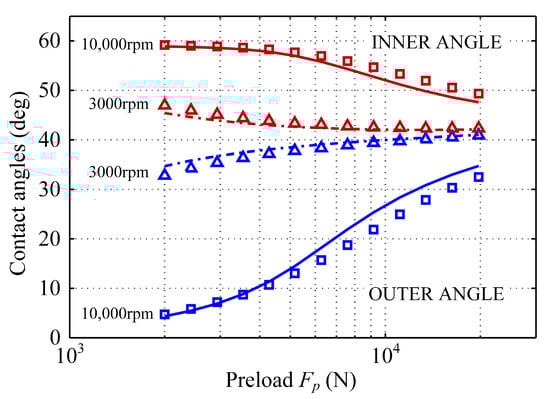 In order to illustrate the validity of the ball bearing model, the contact angle results for the b218 bearing considering different load and speed conditions are compared in Figure 7 with that from Antoine’s work [21]. It can be seen that the contact angle obtained by the present ball bearing model agreed well with the previously published results, and the maximum relative error between them was 16% as the preload was near 8000 N and the bearing speed was 10,000 rpm; However, the error was very small for other running conditions, which validated that the ball bearing model was effective.