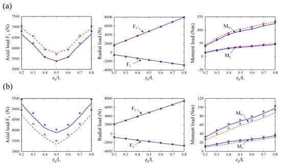 To further validate the effectiveness of the system model, a gear shaft supported by a pair of angular contact ball bearings from Tong’s work [25] was analyzed considering different shaft diameters and bearing arrangements. The bearing displacements and loads are presented in Figure 8 and Figure 9. As shown in Figure 8 and Figure 9, the results calculated by the present system model were very consistent with those from Tong’s model [25], and the difference between the results from the two different models was less than 8%, which verified the system model and the calculation procedure.
