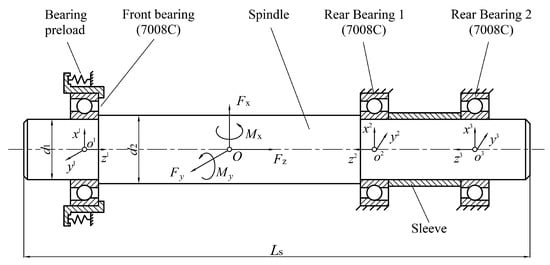 The shaft-bearing system is a key part in mechanical transmissions, in which the rolling element bearing is commonly applied due to its low friction, low wear, and low energy consumption. With the high speed and high precision requirements for rotating machinery, the shaft is usually designed to be supported by multiple rolling element bearings. Many scholars have investigated the dynamic characteristics of the shaft-bearing system [1,2,3], and a comprehensive review on dynamic model development of a shaft-bearing system was also presented [4]. In addition to dynamic analysis, the fatigue life of both the rolling element bearing and shaft system has also attracted much attention. Among various causes that affect the fatigue life of the rolling element bearing, both preload and angular misalignment are two common and important factors.