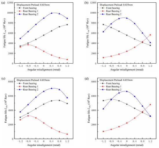 Figure 11 shows the nonlinear dependence of the basic reference rating life of all three bearing on the angular misalignment in the constant-displacement preload condition. As can be seen, the fatigue life of each bearing varied significantly with the angular misalignment, and most of them were not the highest when the angular misalignment was zero, except for that of Rear Bearing 2 in the Case II condition. For each misaligned bearing, an optimal angular misalignment existed regardless of the preload value at which the misaligned bearing had the highest fatigue life. The optimal angular misalignment values were different for the two misaligned bearings, −0.8 mrad for Rear Bearing 1 and 0 mrad for Rear Bearing 2, which mainly depended on the contact force distribution of the misaligned bearings [27]. According to SKF [28], the permissible misalignment angle was 1.2 mrad. It could be seen that the fatigue life of all bearings was very low at either 1.2 mrad or −1.2 mrad compared with that within the permissible misalignment angle, as shown in Figure 11; the angular misalignment approaching the permissible misalignment angle could lead to a significant reduction of bearing life.