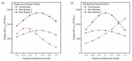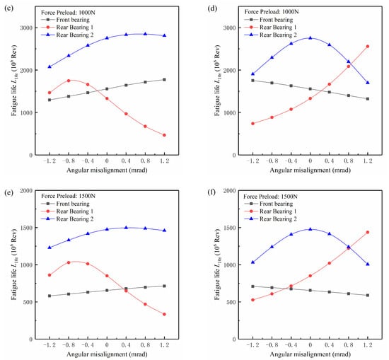 Figure 13 shows the variation of bearing life with the angular misalignment in the constant-force preload condition. In order to analyze the effects of the preload method on the bearing life, the preload force was taken as 500 N, 1000 N, and 1500 N. When the shaft was running without external loads, the preload force of 500 N could cause 0.0355 mm axial displacement of the outer ring of the front bearing, which was very close to 0.035 mm, and the preload force of 1000 N could cause 0.050 mm axial displacement. Therefore, the preload force of 500 N and 1000 N at the constant-force preload could be assumed to be equivalent to the preload displacement of 0.035 mm and 0.050 mm in the constant-displacement preload, respectively. The life comparisons can be made between Figure 11c–f and Figure 13a–d. As can be seen, the two preload methods had a certain effect on the variation of the fatigue life of the preloaded front bearing with the angular misalignment. For the constant-force preload condition, the fatigue life of front bearings was basically linear with angular misalignment, and for the constant-displacement condition, a nonlinear relation could be found. The above difference was mainly due to the outer ring of the front bearing moving slightly with the angular misalignment for the constant-force preload condition, while the outer ring of the front bearing was immovable for the constant-displacement preload condition, which affected the contact force distribution in the front bearing, therefore resulting in different trends of the front bearing life with angular misalignment. With the increasing of the constant-displacement preload, the nonlinear relation between the fatigue life of the front bearing and the angular misalignment became more obvious, as shown in Figure 11. For the constant-force preload condition, the increasing preload force reduced the dependence of the front bearing life on the angular misalignment, and the relation between the front bearing life and the angular misalignment approached a horizontal line at the preload force of 1500 N, as shown in Figure 13. Among the three bearings in the shaft system, the effect of the preload method on the fatigue life of Rear Bearing 1 was the weakest, and the two preload methods only caused a small change in the fatigue life of Rear Bearing 1. From Figure 11c–f and Figure 13a–d, it can be seen that the fatigue life of Rear Bearing 1 was lowest over a wide angular misalignment range, therefore playing a significant role in the system life. Due to the effect of the preload method on the fatigue life of Rear Bearing 1 being very limited, the optimal angular misalignment and highest fatigue life for the shaft system were the same for the two preload methods.