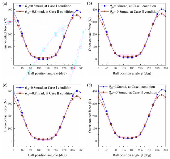 The contact force distribution in Rear Bearing 1 at the optimal angular misalignment of the shaft-bearing system. The preload displacements are 0.025 mm ((a) and (b)) and 0.035 mm ((c) and (d)), respectively.