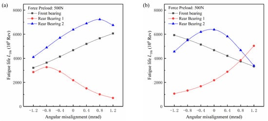 As the preload force reached 1500 N, the system life depended on the fatigue life of both the front bearing and Rear Bearing 1. The optimal angular misalignment for the shaft system was close to 0.4 mrad in the Case I condition and −0.4 mrad in the Case II condition. As mentioned above, the fatigue life of the front bearing varied slowly with angular misalignment, which resulted in very small variation of the system life near the optimal angular misalignment. Therefore, a large range, for example from −0.4 mrad to 0.4 mrad for the Case I condition and from −0.8 mrad to 0.4 mrad for the Case II condition, could be regarded as the optimal angular misalignment range of the shaft system. Such a phenomenon implied that the increasing constant-force preload could weaken the effects of angular misalignment on the system life.