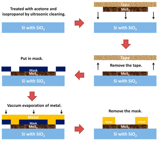 MoS2 materials were purchased from a 2D semiconductors company. We exfoliated MoS2 flakes with 3M Scotch tapes pasting for several times. Then, a substrate of n-type silicon wafer with 300 nm-thick silicon oxide was prepared. It was cleaned with acetone (for 20 min) and isopropanol (for 20 min) by ultrasonic. Then, the MoS2 flake was transferred to the substrate by 3M Scotch tapes. Next, the substrate covered with MoS2 was sent to the vacuum chamber. The first electrode material of Au was evaporated in the chamber through a shadow mask with 50 μm length channel. The fabrication process and structure of FET devices are shown in Figure 1 and Figure 2, respectively. Three other materials of Ag, Al and Cu were used as electrodes in the other three devices fabricated by the process mentioned above. Finally, four FET devices were prepared. The micro-images of the devices were obtained by optical microscope (LEICA DM 2700M), as shown in Figure 3a–d. The electrical properties of the devices were characterized by semiconductor characterization analyzer (Keithley 4200).