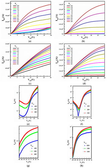 The output and transfer curves of the devices with four types of metallic electrodes are shown in Figure 4. We can find that the devices are n-type depletion FETs as the current appeared in the negative coordinates in the transfer curve with the drain-source voltage of 10 V, 20 V and 30 V, as shown in Figure 4e–h. This result is consistent with previous studies. Meanwhile, we obtained the on/off ratio, threshold voltage (Vth) from the curves and calculated the carrier mobility [15] through the Equation (1). Where W denotes the channel width, L denotes channel length, Ci stands for the capacitance per unit area of silicon oxide.