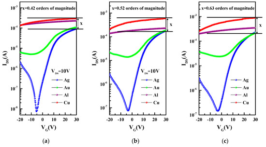 As mentioned above, electrons in semiconductors can enter metals through barriers as long as they have enough energy to cross barriers. Similarly, electrons in metals can also enter semiconductors. Based on the above conditions, the calculation of current can be reduced to the calculation of the number of carriers crossing the barrier, as shown in Equation (2) [16], where A is the Richardson constant (120 A/cm2·K2), T is the thermodynamic temperature (300 K), K0 is the Boltzmann constant (1.380 × 10−23 J/K), VDS is the drain-source voltage (10 V), qΦSB is SBH, q is the electron charge (1.602 × 10−19 C), and J is the current density between semiconductor and metal. It is known that the drain-source current (IDS) is the product of the current density (J) and the average contact area S of the electrode in the device, as shown in Equation (3). We substituted it into Equation (2) to obtain Equation (4). SBHs corresponding to different gate voltages between metals and semiconductors can be calculated with the known constant and IDS in the device transfer characteristic curve at VDS = 10 V.