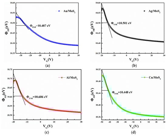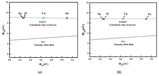 The effective barrier height (ΦESB), defined as the SBH when Vg equals to flat-band voltage (VFB), can be represented as the longitudinal coordinate value corresponding to an intersection point of the tangent of the descending position and the curve, as shown in Figure 6. It can be seen that ΦESB values of the four types of metal–semiconductor contacts ranged from 10.448 to 10.606 eV with a difference of no more than 0.16 eV. In ideal metal–semiconductor contact, SBH can be well predicted by the Schottky–Mott rule, as shown in Equations (5) and (6) [20], where ΦM is the work function of metals; XS and IS are the electron affinity and ionization potential of semiconductors; ΦSB,n and ΦSB,p are the SBH of electrons and holes, respectively. The Schottky–Mott rule shows that ΦSB is linearly related to the work function of metals, and its relationship curve has a uniform slope, as shown in Equation (7). In Equation (7), if S = 1, the metal–semiconductor system conforms to Schottky–Mott rule. However, the calculation based on the experimental data in this paper shows that there is no linear correlation between ΦSB and metal work function for S = 0.11 in the four metal material systems as shown in Figure 7a. Theoretically, the above results are due to the effect of Fermi-level pinning (FLP). Meanwhile, the results we obtained were concluded from the statistical data based on a certain number of devices that meant the experimental results have high repeatability. Moreover, we present another group of four devices with the calculated S value of 0.019 in Figure 7b. This result is in good accordance to the former group.