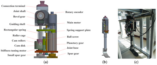 Mechanical structure of APK: (a) the mechanical structure of the VSA joint; (b) virtual prototype; and (c) physical prototype.