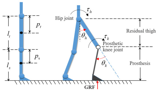 The APK is installed below the residual thigh of the transfemoral amputees and is connected with the thigh receiving cavity of the patient. Then, a strongly coupled human–machine hybrid system is formed between the human body and the APK during walking. The diagram of a human–machine hybrid system in the sagittal plane is exhibited in Figure 2.