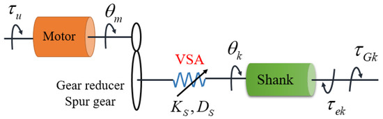 As can be seen from the above equation, the knee joint dynamic model includes the independent term of the knee joint and the coupled term between the knee joint and the hip joint. Furthermore, the knee joint is driven by VSA, and the dynamic model of the APK joint is also related to the VSA driver. The schematic diagram of the VSA knee joint model is shown in Figure 3.
