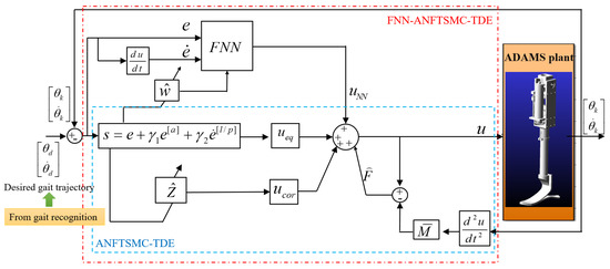 We constructed a virtual prototype with ADAMS to testify to the significance of the proposed method. The architecture of the controller is shown in Figure 4. In the ANFTSMC-TDE sub-controller, the nonlinearity and uncertainty of APK dynamics are estimated by TDE technique. A fuzzy neural network is thus designed to compensate for TDE error. First, we verified the effectiveness and robustness of the proposed method in the swing phase comparing with the other two traditional TDE methods. Then, we validated the performance of VSA under different stiffnesses. Finally, we constructed a human–machine hybrid model to confirm the proposed method.