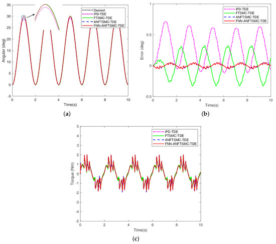 Simulation results of comparison among iPD-TDE, FTSMC-TDE, ANFTSMC-TDE, and FNN-ANFTSMC-TDE: (a) trajectory tracking; (b) trajectory error; and (c) control torque.