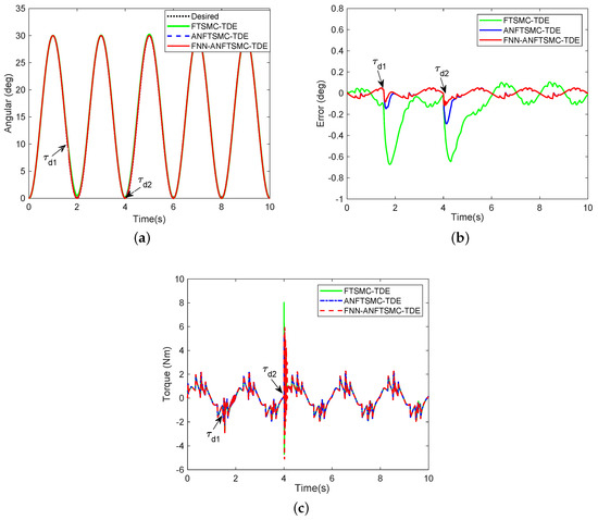 Furthermore, we supplied two more complex disturbances and into the system. The previous disturbance means a loss fault in the actuator at and the duration was 0.03 s. The latter disturbance is a time-varying signals at t = 4 s. No experiments on iPD-TDE were performed due to failure tracking at any disturbance. To facilitate comparison, based on Figure 7a–c, we can draw the following conclusions: (1) FNN-ANFTSMC-TDE and ANFTSMC-TDE give better performance compared to FTSMC-TDE under all kinds of interference; and (2) FNN-ANFTSMC-TDE has stronger robustness when interference occurs.