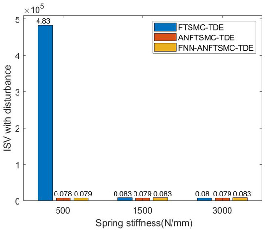 Simulation results of ISV among FTSMC-TDE, ANFTSMC-TDE, and FNN-ANFTSMC-TDE under different joint stiffnesses: (a) ISV without disturbance; and (b) ISV when and occur.