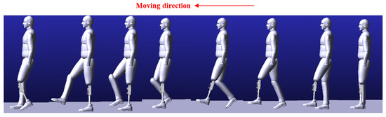 It can be concluded from the results in Figure 10 that the gait tracking error of the human–machine hybrid system is more significant than that of the one-leg swing because of various nonlinear and uncertain factors. However, this accuracy is sufficient to ensure humans walk stably. As shown in Figure 11, the dynamic screenshot of a gait cycle is described, and the posture of the prosthetic knee is natural. Gait tracking control is well realized in this paper.