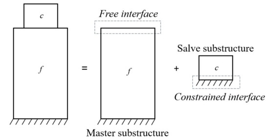 In the B-H method, the original system is divided into two groups: master substructures and slave substructures. All the substructures are non-overlapping so that each node belongs to exactly one substructure except for the nodes on the coupling interface. In Figure 1, only one master substructure and one slave substructure are shown as demonstration. Different interconnection conditions are imposed on each part, where the interconnection of the master substructure is constrained while that of the slave substructure is free. Then, Equation (1) can be rewritten in block matrices as