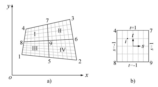 Dividing the coupling interface into four sub-regions (I ∼ IV), as shown in Figure 2a. The nodes 1∼9 is defined as interpolation basic nodes (IBNs), and then the force and displacement of each node (Figure 2b) can be described approximately by that of the IBNs by a set of shape functions [42]. The displacement or force interpolation formulations of the rectangular element are