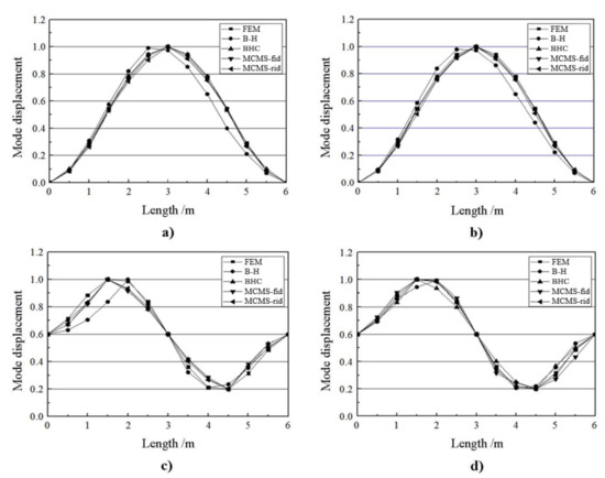 We firstly compare eigenvalue features of the MCMS-rid method with other three existing MCMS methods, including the B-H method, B-H method with normal mode correction (BHC) and the revised MCMS method with full coupling interface DOFs (MCMS-fid) [43]. For the MCMS-rid method, the coupling interface is divided into four sub-regions (Figure 4b) and the corner nodes of each sub-region are chosen as IBNs. Thus, the number of the coupling interface DOFs are reduced from 75 to 27. The first eight natural frequencies calculated by each method are listed in Table 1, where “FEM” indicates the exact numerical solutions of the whole beam. The relative errors of the natural frequencies for MCMS methods are also done by Equation (61), and the “Method” in the equation refers to “B-H, BHC, MCMS-fid and MCMS-rid”. The numbers of the retained DOFs involved in docking and mode synthesis for each method are also shown in Table 1 (in parenthesis).