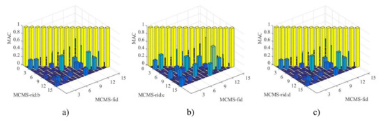 Modal assurance criterion between the modes by the MCMS-fid method and MCMS-rid method different interpolation schemes. (a) MCMS-rid:b vs. MCMS-fid; (b) MCMS-rid:c vs. MCMS-fid; (c) MCMS-rid:d vs. MCMS-fid.