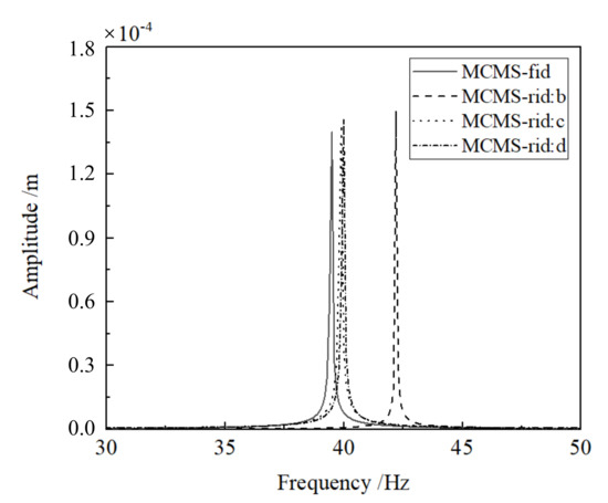 The MAC between the modes by the MCMS-fid method and the MCMS-rid method with different interpolation schemes are plotted in Figure 6. It is seen that the mods of the MCMS-fid method and the MCMS-rid method are identical to each other, which gives confidence in the MCMS-rid method. The FRF comparisons, shown in Figure 7, are conducted by applying a harmonic excitation at excitation level of 1N in the Y direction in the middle of the beam. It illustrates that the MCMS-rid method with nine and 10 IBNs have better capability to capture the dynamic responses of the beam than the MCMS-rid method with four IBNs in terms of both the resonance frequency and its corresponding amplitude, confirming that both the number and distribution of the IBNs have a huge effect on the validity of the proposed method.