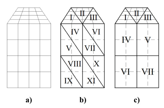 The second example is a three-dimensional elastic body with a polygon section (H = 7 m, W = 4 m and L = 12 m). The material properties of the beam are: = 1800 kg/m, E = 10 MPa and = 0.3. The nodes on the base of the model are fixed. The FE model with 315 nodes and 945 DOFs in total is shown in Figure 8. The overall model is divided into two components numbered “1” and “2”, and two interpolating schemes (Figure 9c) are adopted. In scheme (b), only triangular interpolation sub-regions are introduced. While in scheme (c), both quadrangle and triangular interpolation sub-regions are used. All the corner nodes of the sub-regions for scheme (b) and (c) are assigned as the IBNs, with the number of 11.