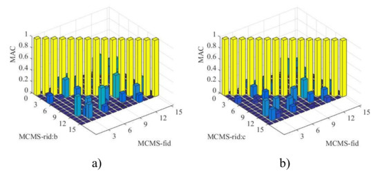 Modal assurance criterion between the modes by the MCMS-fid method and MCMS-rid method different interpolation schemes. (a) MCMS-rid:b vs. MCMS-fid; (b) MCMS-rid:c vs. MCMS-fid.