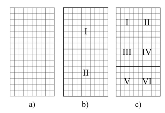 The effect of the number and distribution of the IBNs on the eigenvalue performance of the MCMS-rid method is studied as well. As shown in Figure 4, four interpolation schemes are considered for mode synthesis. For scheme (a), all the coupling interface nodes are involved in docking of substructures, i.e., MCMS-fid. For case (c), the four corner nodes of the coupling interface are assigned as the IBNs (only one sub-region). In case (b) and (d), the coupling interface is divided into four sub-regions with different shape, and all the corner nodes of the sub-regions are assigned as the IBNs. Scheme (a) is taken as exact solutions, and the relative errors for other schemes are calculated by Equation (62), where “Scheme” in the equation indicates “(b), (c) and (d)”.
