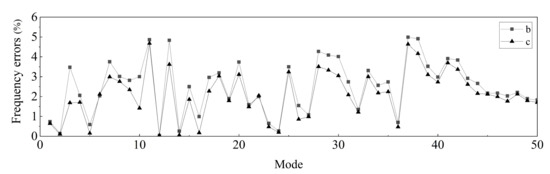 Relative errors (%) of the first fifty natural frequencies for Scheme b and c.
