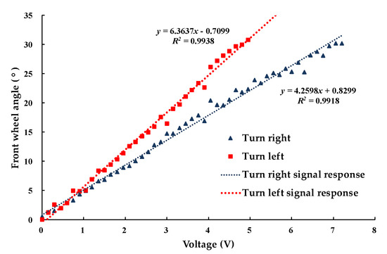In order to test the performance of the front wheel angle system, a bench test was designed. The front wheel was set up, the test platform was in no-load state and the pulse control signal was applied to control the front wheel of the test platform to rotate 30° to the left and right (the maximum rotation angle of the test platform was [−30°, 30°]). The result is shown in Figure 3. The fitting degree R2 of the regression equation of the left and right turn response curves of the test platform was 0.9938 and 0.9918, respectively, indicating that the system obtains the rotation angle as linear.